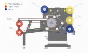Modul de functionare: role de hartie digitale pe bucati de tesatura, role de hartie digitale in role de tesatura, bucati de hartie digitale in bucati de tesatura.